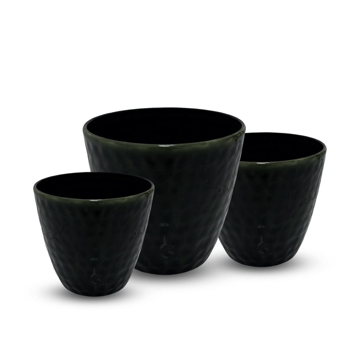Set of 3 mild steel indoor plant pots from the Black Dots Mini Alisa Hammered collection. Features a hammered black dotted texture and tapered shape for durable and modern decor.