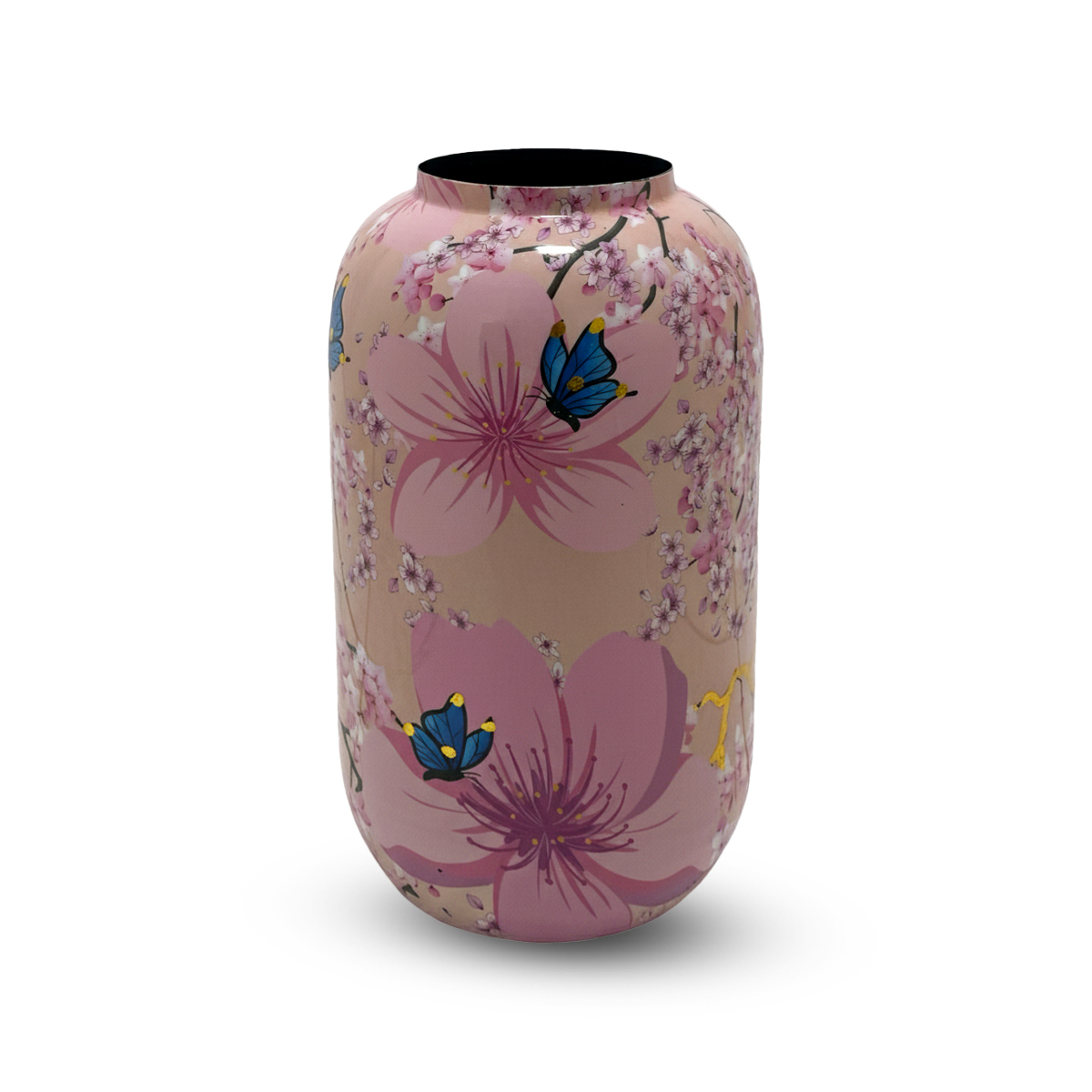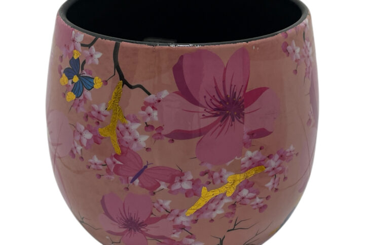 Large capsule-shaped indoor plant pot from the Bloom Butterfly collection. Features a pink floral and butterfly design with a glossy finish for vibrant home decor.