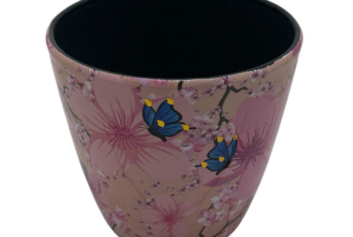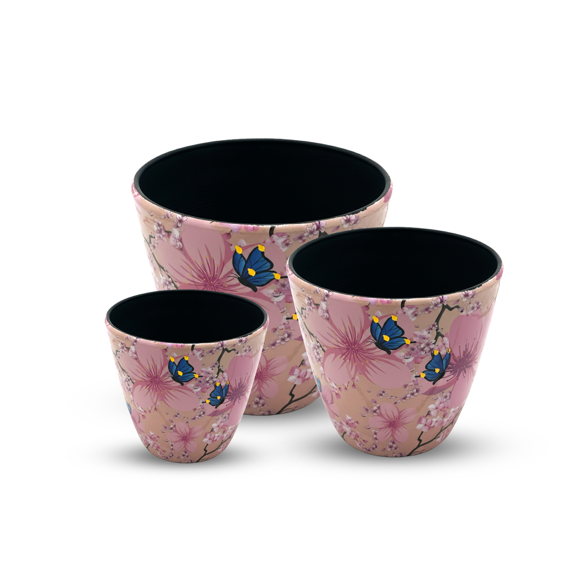 Set of 3 indoor plant pots from the Bloom Butterfly collection. Features a pink glossy finish with floral and butterfly design for vibrant and compact home decor.
