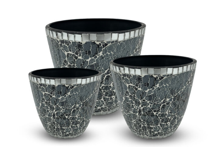 The Blue Ice Mini Alisa set includes 3 indoor plant pots that combine modern texture with a clean, compact form. Each pot features a tapered shape and a grey-blue mosaic tile pattern that reflects light and adds depth to your interior.
