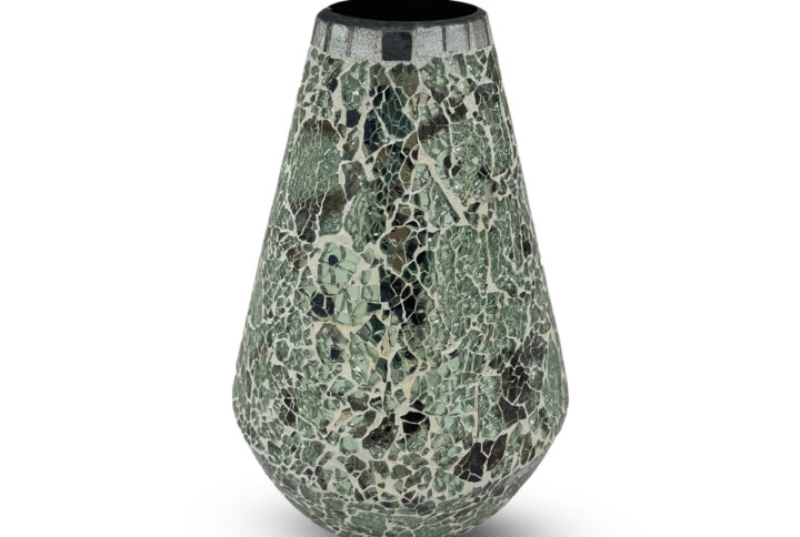 The Blue Ice Flowerpot Cone is a distinctive indoor planter designed to make a statement. Its unique cone shape is finished with a textured grey-blue mosaic tile design and a polished metallic rim that adds a touch of sophistication to any room.