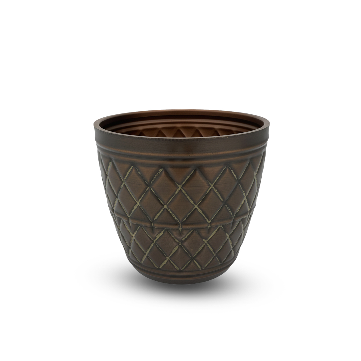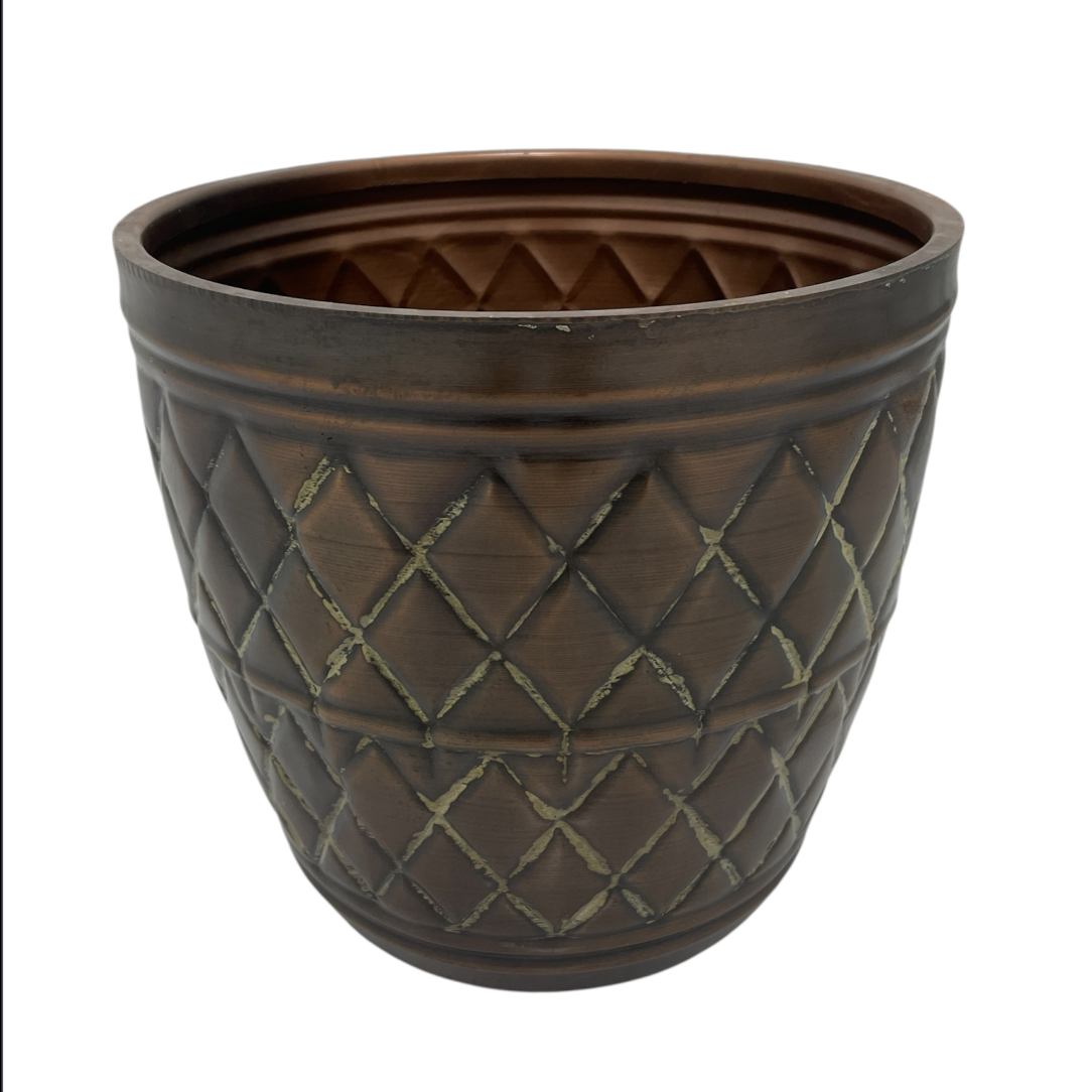Set of 4 conical metal planters with a copper finish and diamond pattern ? perfect for indoor floor use.