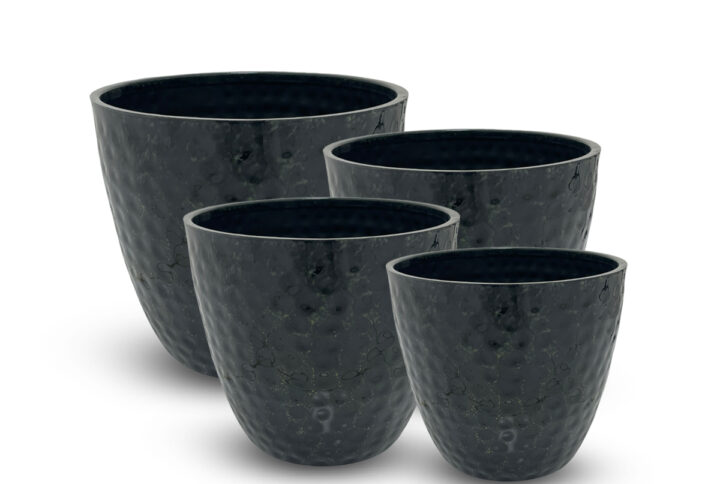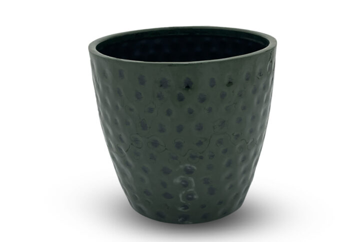 Set of 4 indoor plant pots from the Green Forest Roan Hammered collection. Features a forest green matte finish with hammered dot texture for natural and modern decor.