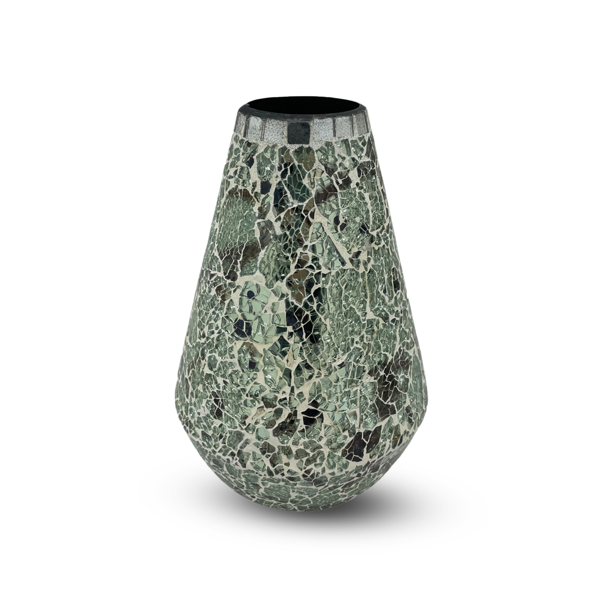 Cone-shaped indoor plant pot from the Green Ice collection. Features a green mosaic tile finish with a metallic rim for elegant and modern home decor.