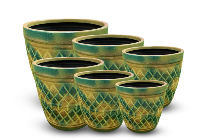 A 6-piece set of conical indoor floor planters made of mild steel, featuring a glossy green finish with diamond pattern detailing.