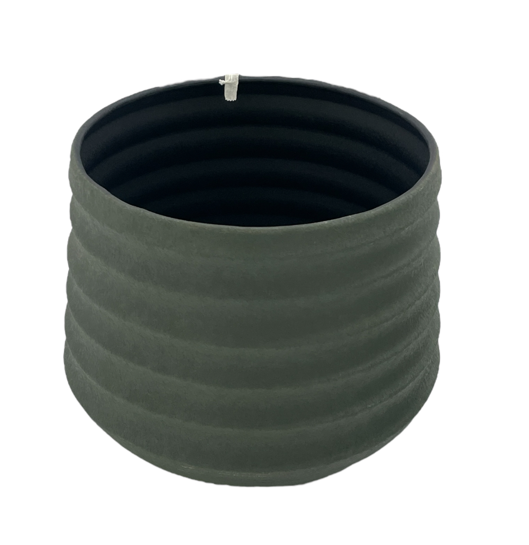 Set of 3 outdoor metal planters in a matte green finish with a ribbed texture and round shape, perfect for modern garden styling.
