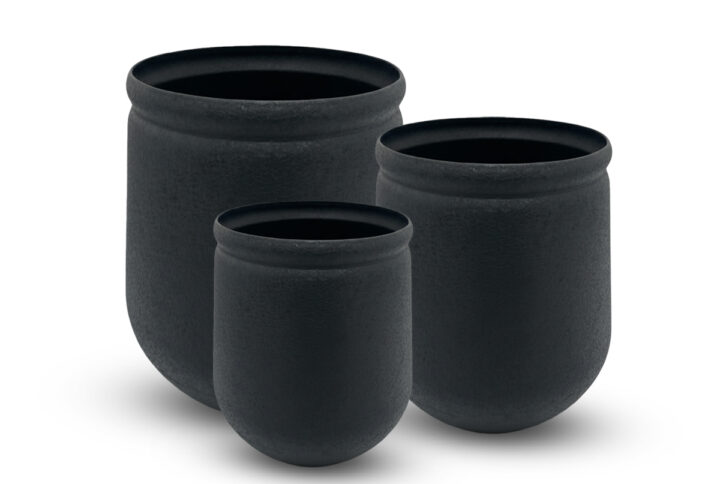 Set of 3 black matte finish metal planters with a sharp neck design, perfect for bold and contemporary outdoor floor d?cor.