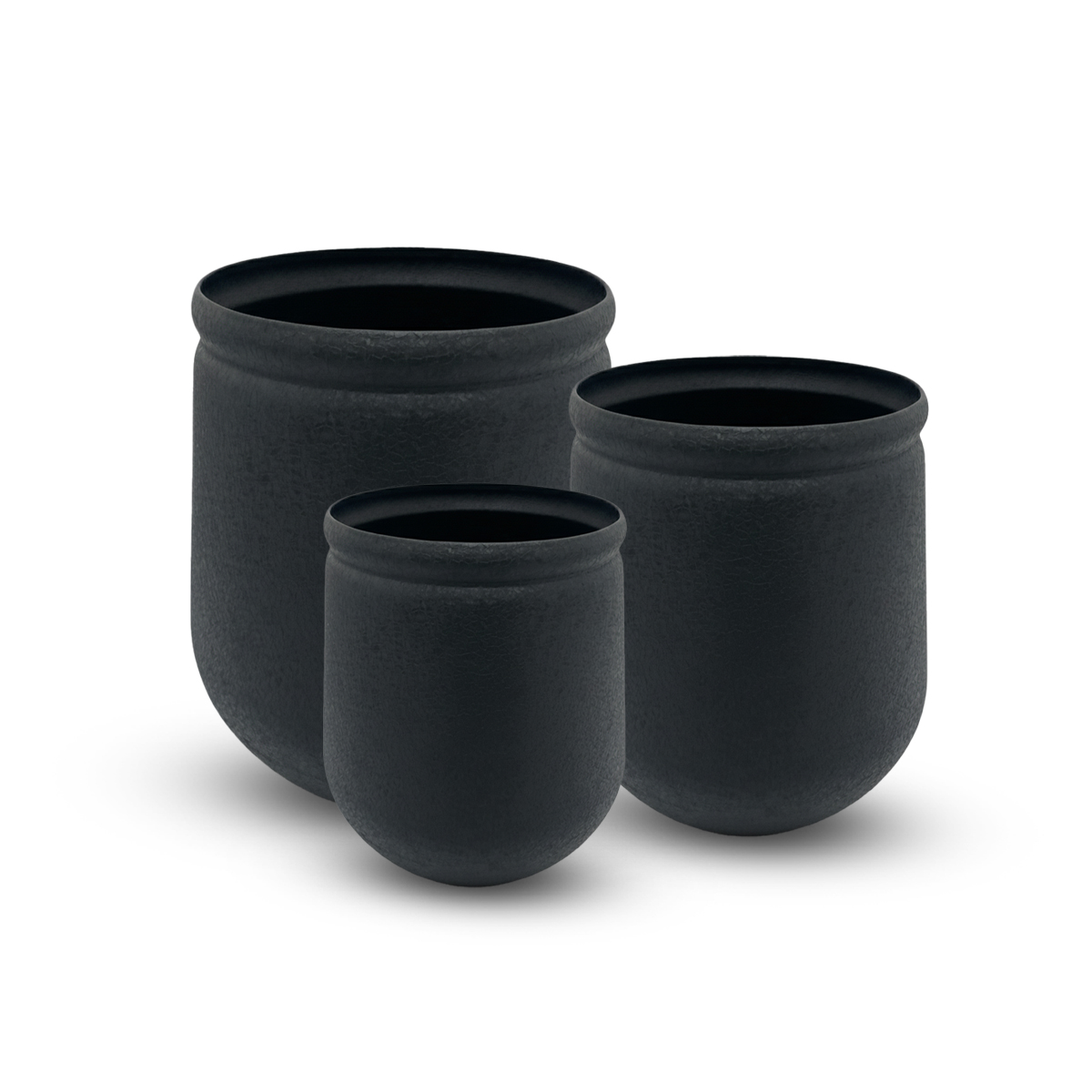 Set of 3 black matte finish metal planters with a sharp neck design, perfect for bold and contemporary outdoor floor d?cor.