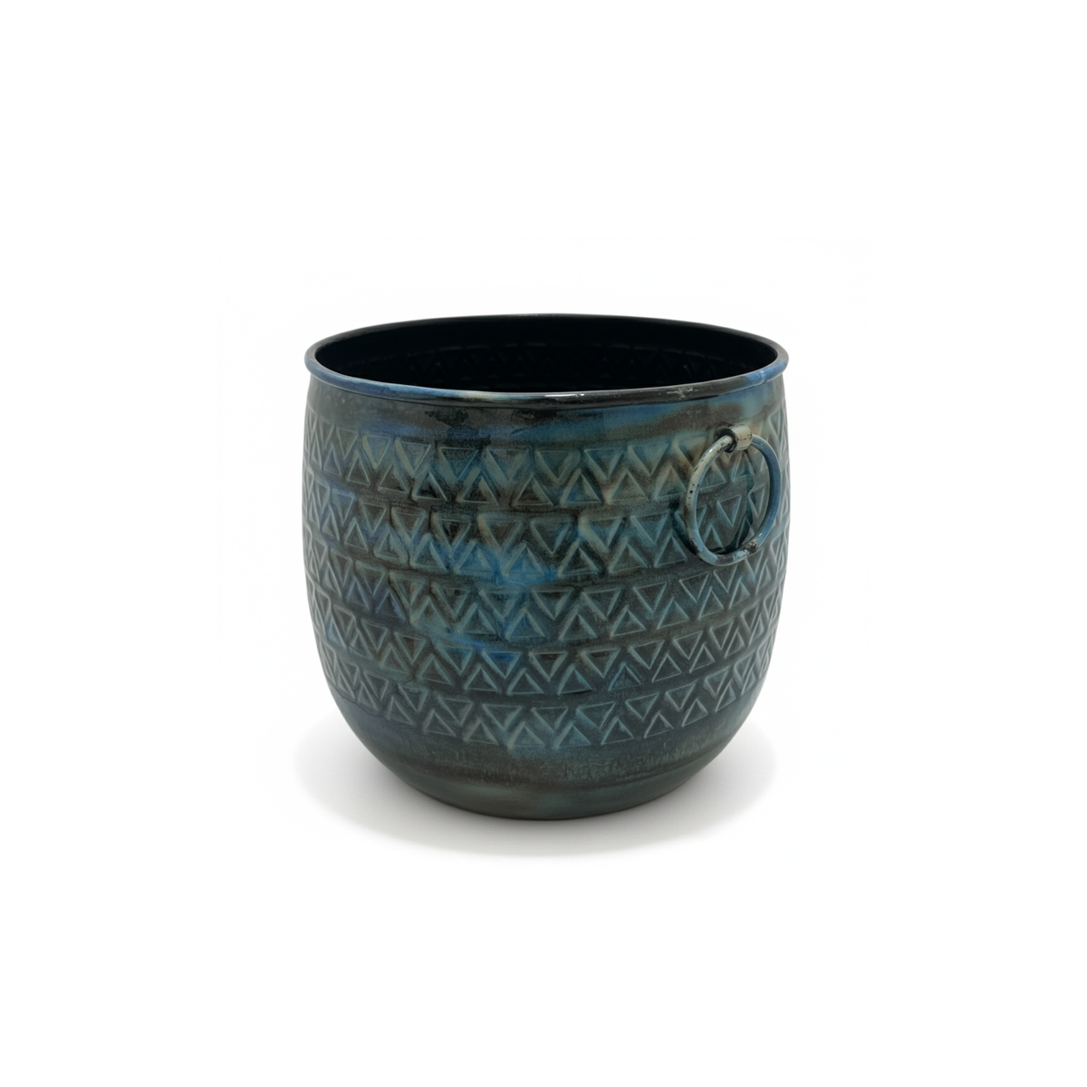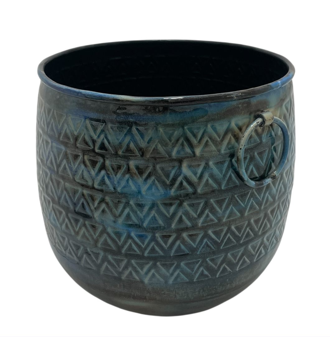 Denim Blue Verdant Vessel Barrel Metal Planters for a set of 3. These indoor round planters for floors come in a barrel design with a matte finish, combining rustic aesthetics and contemporary design for fashionable home decor.